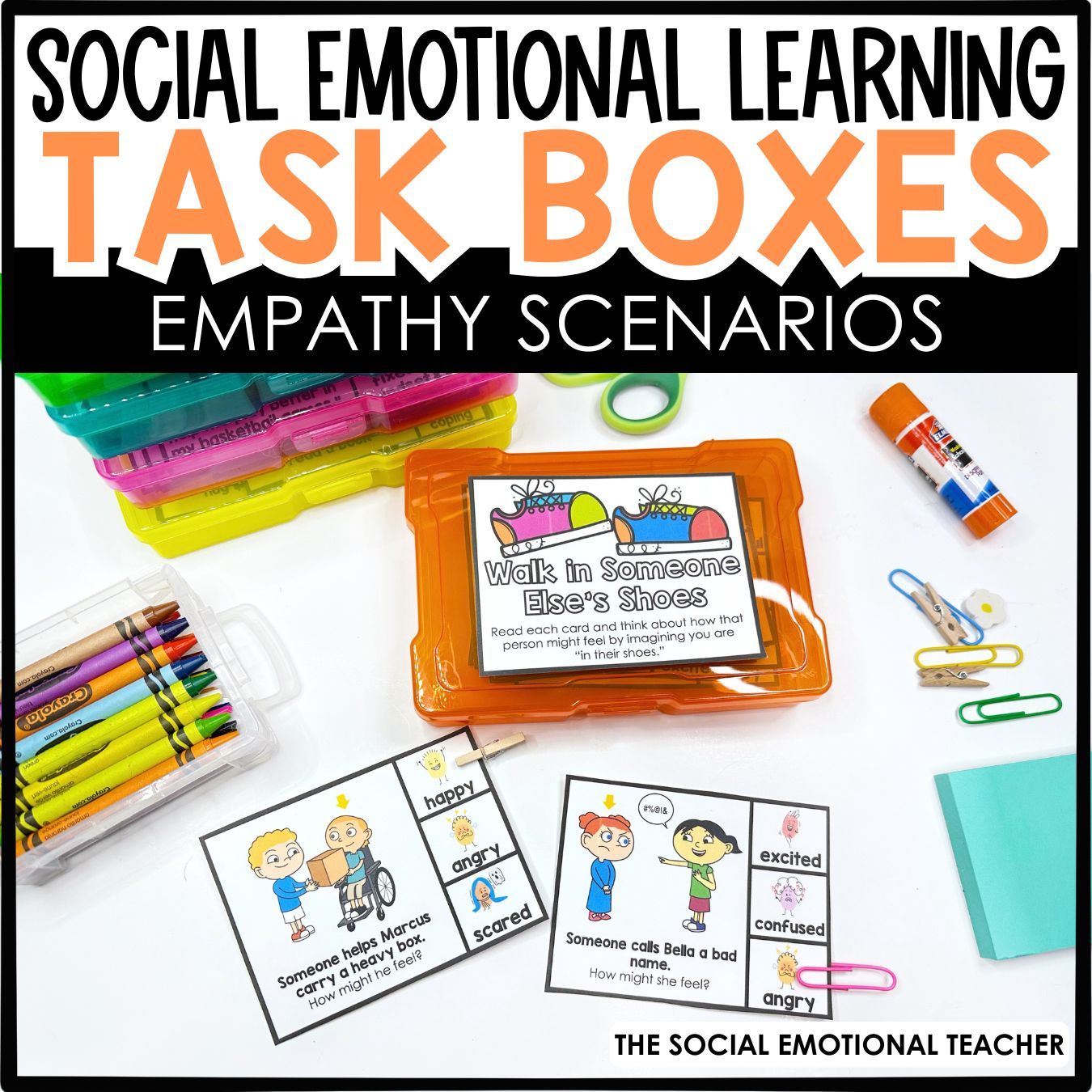 Help students build empathy by stepping into someone else’s shoes with these Empathy Scenario Task Card Boxes for SEL!